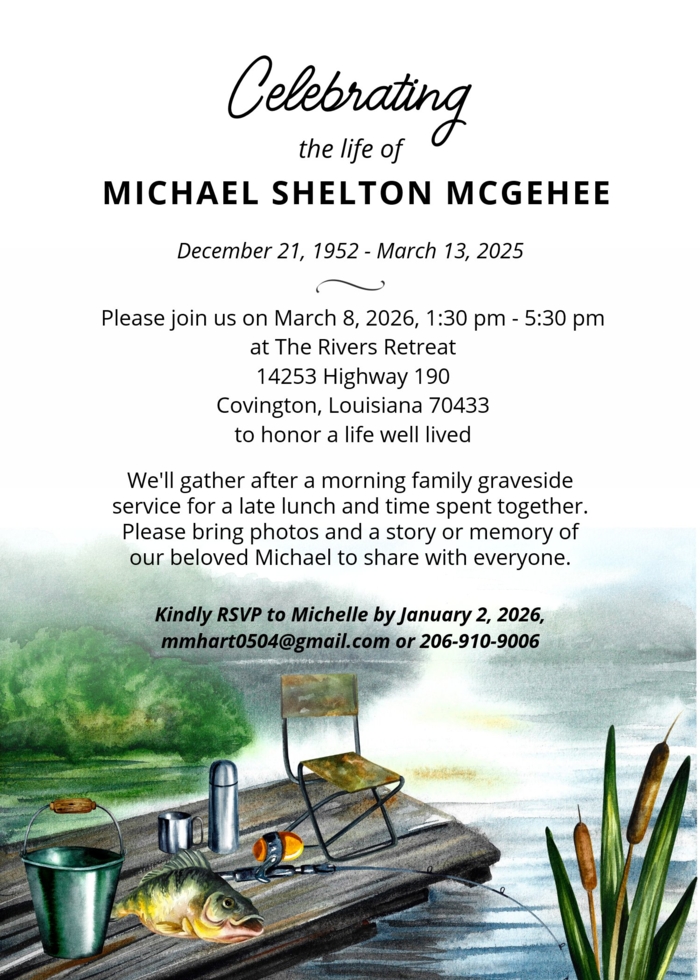 On behalf of the McGehee family, I would like to express my sincere gratitude to everyone who knew and worked with my father, Michael McGehee, over the years and left comments on the notification of his passing. This meant a lot to our family and I know it would mean a lot to him. I talked with my dad all the time about his work. He shared his stories about his days on the job with me, as well as so many wonderful things about his co-workers/friends. His career meant a lot to him, as did all of the people he worked with. I know he felt honored to be there and to be with them. I am attaching information regarding his celebration of life in March. Please disregard the RSVP date, as this was sent out several months ago now. I am not a member on this site, so if anyone is interested in contacting me for more information, please email me at the address located in the invitation. Thank you again so much. Michelle Hart (McGehee)